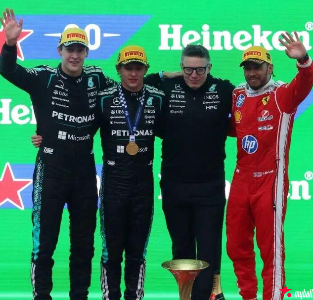 来自梅赛德斯-马石油车队的意大利小将安德烈亚·基米·安东内利获得其职业生涯首个分站赛冠军,他的队友乔治·拉塞尔获得亚军。来自法拉利-惠普车队的刘易斯·汉密尔顿拿下季军,斩获他加盟法拉利之后的第一个领奖台。左起:拉塞尔、安东内利、邦宁顿(梅赛德斯车队比赛工程师)、汉密尔顿
