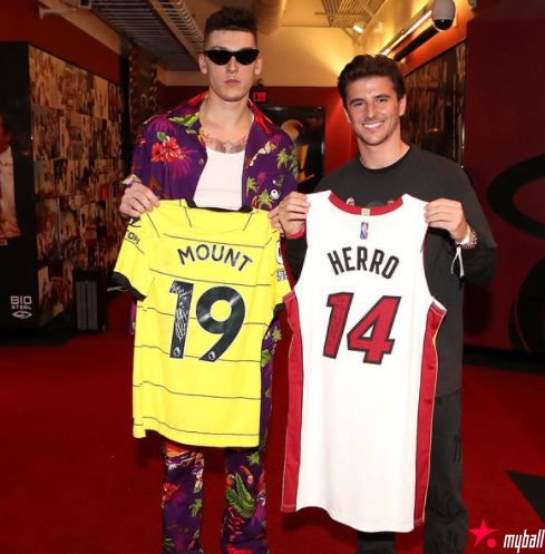 在芒特与泰勒·赫罗交换个性化球衣之前,这对蓝军与热火球星巴姆·阿德巴约会面。