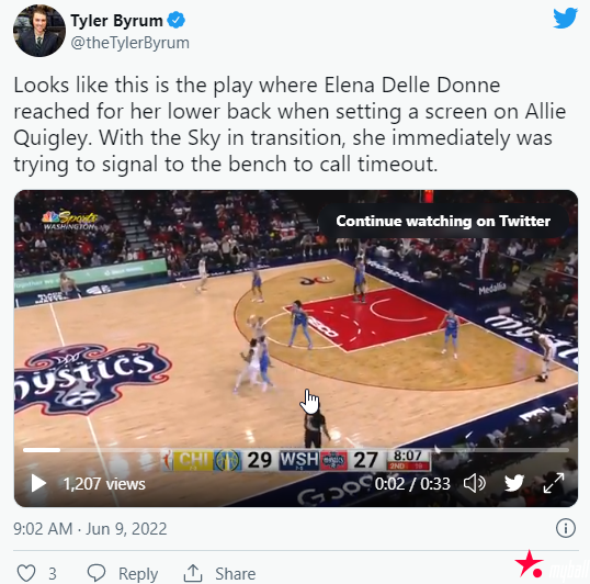 然而,在第二节对阵天空的比赛中发生了一些事情。戴尔·多恩(Delle Donne)在艾莉·奎格利(Allie Quigley)身上设置了一个屏幕,并抓住了她的右臀部上方。当芝加哥 想要一个快攻机会时,戴尔多恩试图引起神秘人替补席的注意,要求暂停。Thibault 同意后,Delle Donne 直接和她的教练商量,然后回到了 Mystics 更衣室。