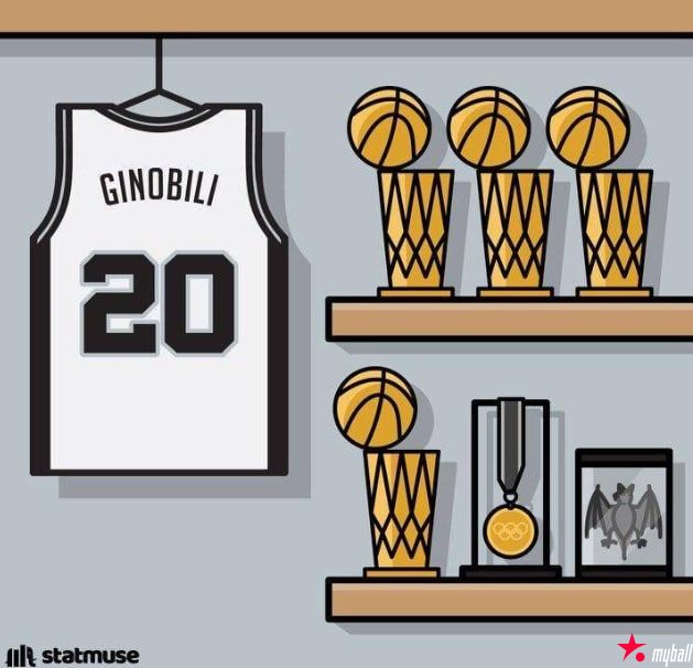 荣誉图中,有吉诺比利随马刺拿下的4座总冠军奖杯,还有2004年他率阿根廷击败美国夺得的奥运会金牌,以及一只他在NBA赛场中徒手抓到的蝙蝠~