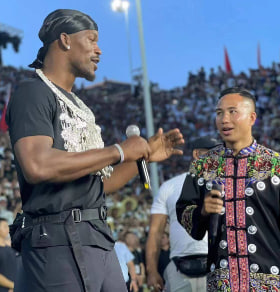 接着,巴特勒同样在现场大秀一番球技,并用一次扣篮打进了他在村BA赛场上极具象征意义的第一球。此后的互动环节,巴特勒又学起了贵州当地的方言,再度将现场观众的情绪调动起来。