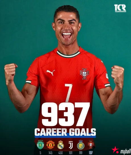 至此,C罗职业生涯已经攻入937粒进球,分别是: