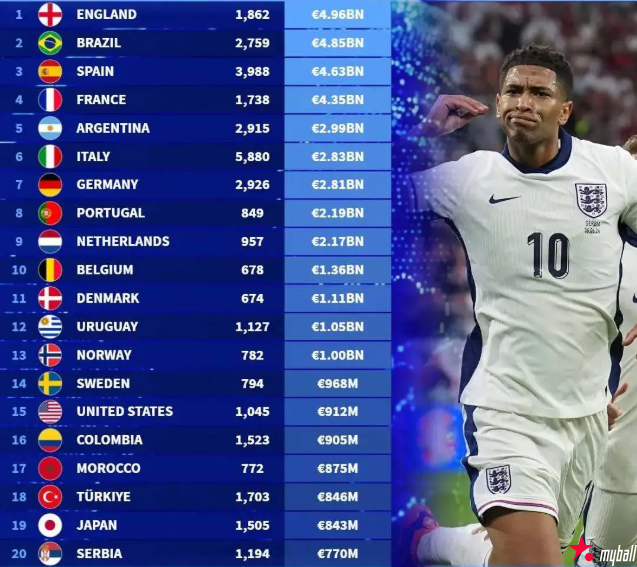 ​德国转会市场统计了各国球员的身价总和,英格兰位列榜首,巴西和西班牙紧随其后,亚足联仅日本进入前二十。
