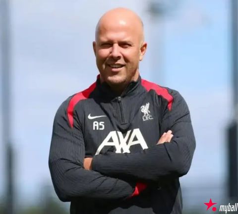 2025年8月5日讯:阿恩·斯洛特在训练期间双臂交叉微笑。