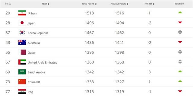 国际足联近日公布了新一期的世界排名,国足排名亚洲第8位,世界第73位。