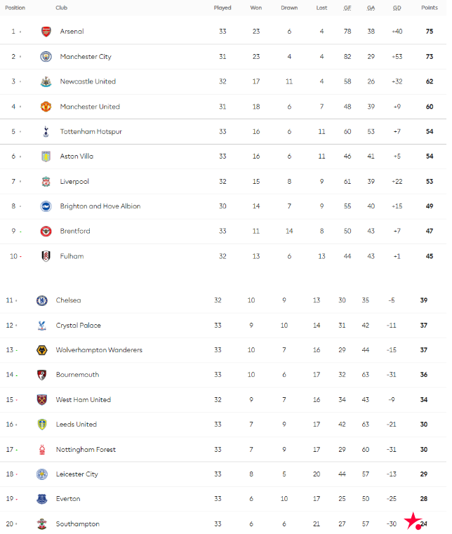 最新的英超积分榜:阿森纳(75)、曼城(73)、纽卡斯尔(62)、曼联(60)、热刺(54)、维拉(54)、利物浦(53)、布莱顿(49)、布伦特福德(47)、富勒姆(45)、