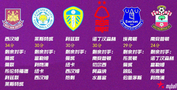 西汉姆联:33场34分,剩余对手有曼城、曼联、布伦特福德、利兹联、莱斯特城;保级的可能性很大。