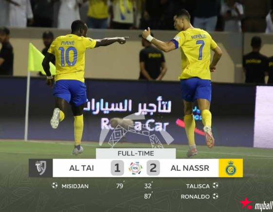 第87分钟,塔利斯卡禁区内头球攻门,皮球打在阿尔法左侧手臂上,当值主裁查看VAR后判罚点球,随后C罗主罚右脚爆射命中,利雅得胜利完成绝杀,2-1!此后,双方均无建树。全场比赛结束,利雅得胜利2-1击败塔伊。