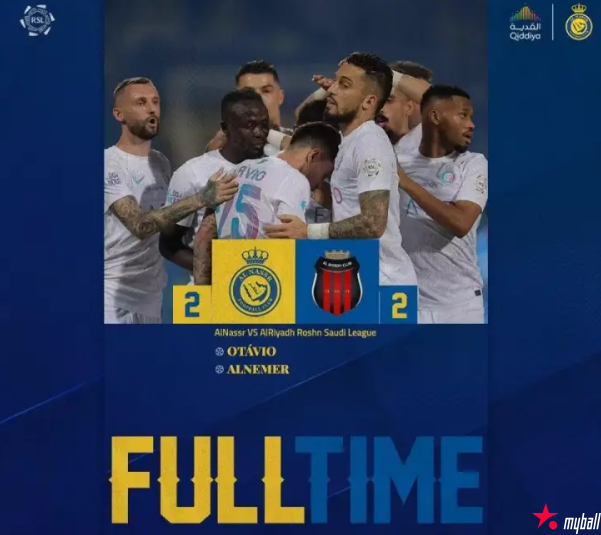 第77分钟,马内小禁区内左脚推射遭对方后卫门线上解围。第85分钟,C罗禁区中路右脚推射破门,边裁举旗示意越位在先,进球无效。终场伤停补时最后1分钟,阿姆里禁区右侧头球摆渡被对方门将扑了一下,梅沙里-内梅尔后点在无人盯防的情况下右脚撞射破门,利雅得胜利绝平,2-2!全场比赛结束,利雅得胜利客场2-2战平利雅得体育。