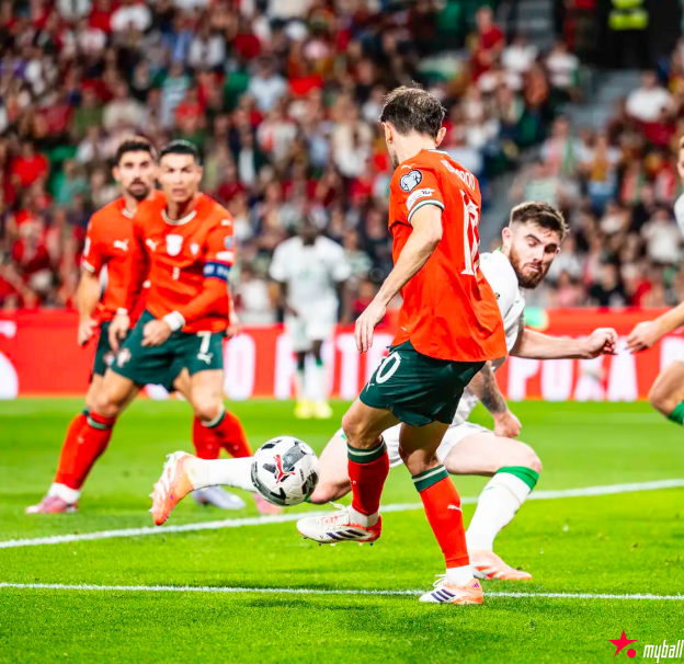 本场比赛,葡萄牙中场若昂-内维斯因伤缺阵,B费担任前腰,C罗第224次出战A级赛事,继续刷新男足国家队历史出场榜纪录;爱尔兰方面,多尔蒂和拉瓦尔因伤缺阵,埃文-弗格森出任单箭头领衔首发阵容。第7分钟,内托送出传中球,门德斯小禁区左侧抢点射门偏出右门柱。第9分钟,门德斯做球,B费禁区弧顶打门偏出右门柱。第17分钟,C罗禁区弧顶左侧低射右下角击中右立柱,B席小禁区前面对空门补射偏靶左门柱。第18分钟,埃博塞莱放倒门德斯被黄牌警告。