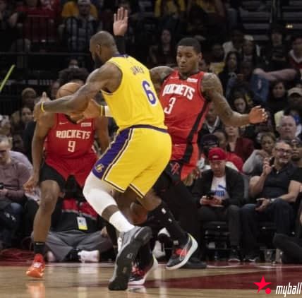 憋了一肚子火,詹姆斯下半场刚开始就带队开始追分,第一次得分又是在内线强行完成二次补篮。除此之外,詹姆斯第三节刚开始已经拿下准三双,湖人队的进攻有所起色詹姆斯下半场刚开始已经送出8次助攻。实际上算上这场比赛的最近10场比赛,詹姆斯助攻是衰退的,8次已经是过去10场的最好纪录。第三节中段,詹姆斯的一次强行突破遭遇“爆头”防守,但还是完成了2+1上篮,此时湖人队第二次从落后8分追上火箭。