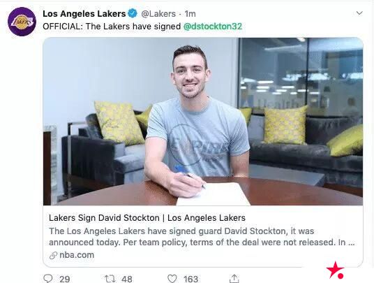 迈博体育 湖人官方宣布签下传奇巨星之子小斯托克顿 NBA生涯 2019-10-06 20:17:24