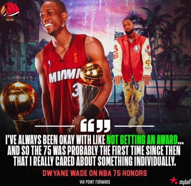 韦德表示:“若我没获得某个奖项,我一直都不在乎。但‘NBA历史75大巨星’可能是我第一次真正在乎的奖项。”