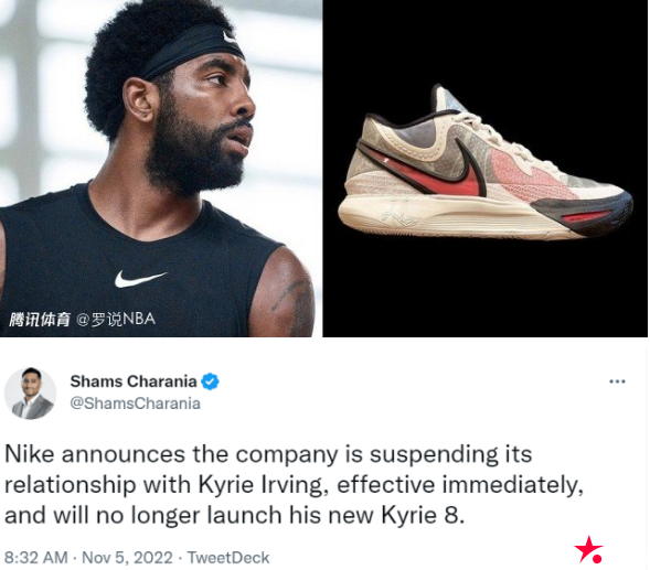 北京时间11月5日,据名记Shams报道,耐克已经宣布与欧文暂停合作,不再发布他的新鞋Kyrie 8,这也意味着欧文连续受到打击。此前他被篮网禁赛至少5场,已经要损失超过120万美元的薪水,现在他的代言品牌也开始宣布和他暂停合作了。Nike官方表示:在Nike,仇恨言论没有容身之地,我们谴责任何形式的反犹太主义……我们对此种情况的发生和受到影响的人们感到伤心和失望。
