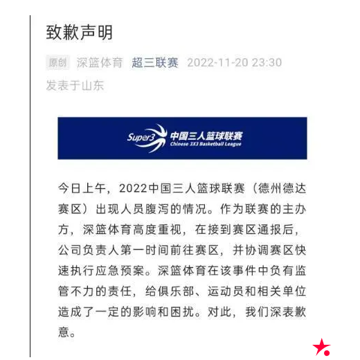 2022年中国三人篮球联赛山东德州赛区出现人员集体腹泻。作为联赛的主办方,深篮体育公司虽然发布了致歉信,但依然无法止住外界的吐槽和攻击。