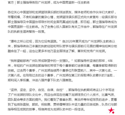 主教练郭士强担任中国男篮主教练,对于郭士强离开仿佛从李炎哲离队开始,他作为职业教练连续带领广州男篮闯进季后赛非常值得外界的肯定,只是随着俱乐部方向发生变化,他离开广州男篮并不意外。