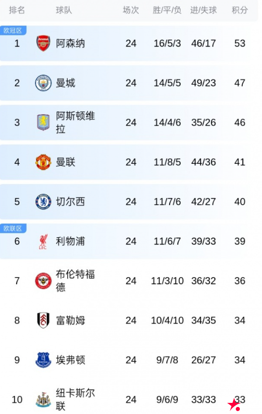 北京时间2月2日消息,2025-26赛季英超第24轮,阿森纳4-0利兹联结束三轮不胜,切尔西主场上演“让二追三”的戏码3-2逆转西汉姆联,热刺2-2战平曼城,最新的积分榜情况如下↓