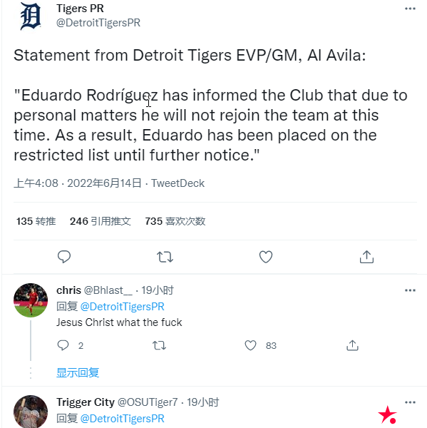根据老虎队经理 AJ Hinch 的说法,声明“就是这样”。