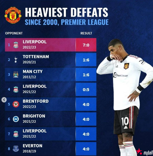 此外,红魔还分别以1:6的比分输给过热刺和曼城,以0:4的比分输给过布莱顿、埃弗顿、和切尔西。