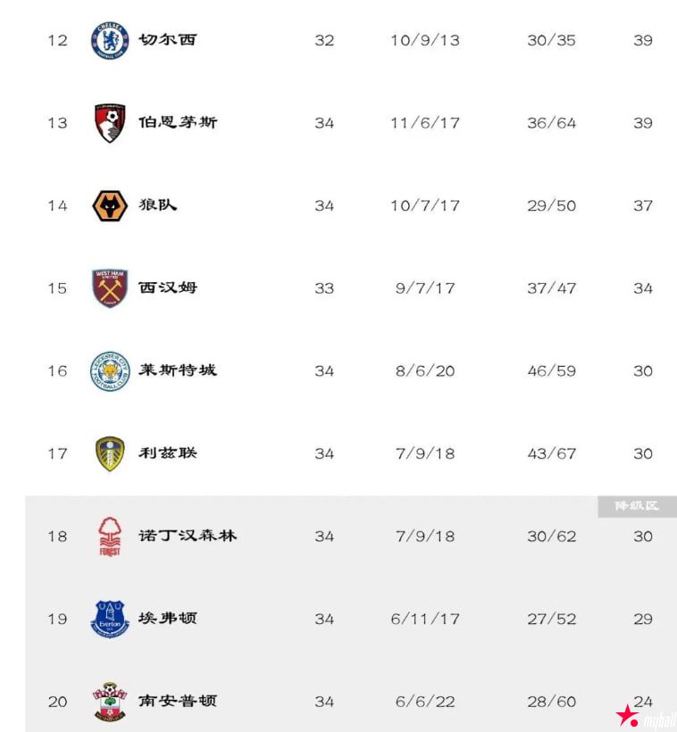 我们先来看看英超积分榜情况,南安普顿34轮过后仅积24分,深陷降级区,排名垫底。埃弗顿积29分排名倒数第2,莱斯特城积30分,与诺丁汉森林和利兹联同积30分,西汉姆联33轮过后积34分排名第15,狼队积37分排名第14,伯恩茅斯和切尔西同积39分排名第13和第12,水晶宫本轮获胜后积分达到40分,刚好撞线以往赛季保级的安全线。