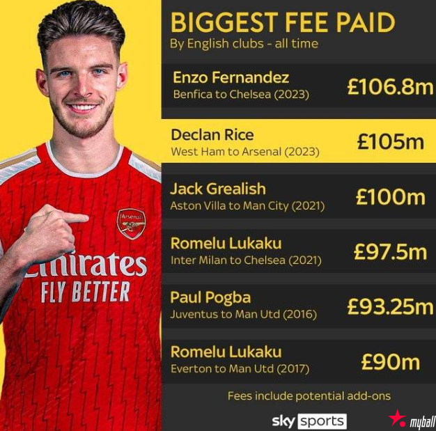 在赖斯以1.05亿英镑的转会费从西汉姆联加盟阿森纳之后,《天空体育》盘点了英超引援的前六名。