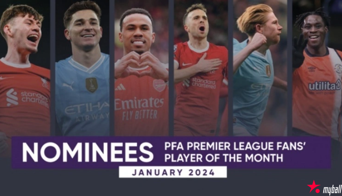 PFA(英格兰职业球员工会)公布了1月最佳球员的候选名单。其中,小将布拉德利入选,德布劳内、加布里埃尔等共6名球员在列。